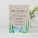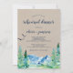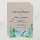 This kraft Rocky Mountain rehearsal dinner invitation is perfect for an outdoor wedding rehearsal. The design features a blue and green painted wilderness landscape with watercolor pine trees, birds and mountains on a faux light kraft paper background.