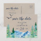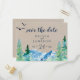 This kraft Rocky Mountain save the date postcard is perfect for an outdoor wedding. The design features a blue and green painted wilderness landscape with watercolor pine trees, birds and mountains on a faux light kraft paper background.