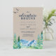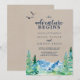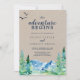 This kraft Rocky Mountain the adventure begins wedding invitation is perfect for an outdoor wedding. The design features a blue and green painted wilderness landscape with watercolor pine trees, birds and mountains on a faux light kraft paper background.