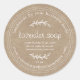 The Kraft White Rustic Lavender Soap Label features a warm kraft-paper background with soft white lettering, stitched-border accents, and simple botanical flourishes for an artisanal, handmade feel. Ideal for small-batch lavender soap, farmer’s market products, and natural body care packaging, this round label includes space for ingredients, weight, and your business name or website. Its rustic charm and clean layout add a polished, handcrafted touch to every bar.