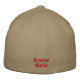 Fits well due to elastic edging, not adjustable. Good qualty material. Good quality embroidering. Subtle lettering (white on beige) just as my wife likes.