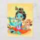 Krishna the Holy Indian God playing flute illustration sitting next to a cow with jasmine garlands, peacock feather and bird composed art.