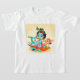 Krishna the Holy Indian God playing flute illustration sitting next to a cow with jasmine garlands, peacock feather and bird composed art.