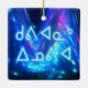A pink and blue, fractal interpretation of the Northern Lights reflected on the surface of the sea. Qaanaaq is a settlement in northern Greenland. Inuktitut text reading "Kuvianak Innovia" (ᑯᕕᐊᓇᒃ+ᐃᓄᕕᐊ - Merry Christmas), in the syllabic alphabet adopted in Nunavut, also appears in glowing blue and white. The Inuit are commonly referred to as Eskimo, but that term is now disfavored as it is considered to be pejorative.