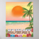 kuwait beach Travel poster of a hot setting desert middle eastern sun setting in the evening, there is a tall beautiful palm tree in the foreground.