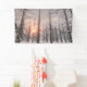 Un soleil pâle d'hiver place derrière les arbres de mélèze trés hauts comme les sentinelles foncées. Leurs branches noueuses, découvrent excepté un saupoudrage de neige, et les or, les roses, et les bleus en pastel du ciel de coucher du soleil sont vus comme par une brume rêveuse. Dans le premier plan les flocons de neige tombent doucement.