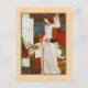 Beautiful 19th century painting by William Morris called La Belle Iseult and featuring a beautiful Renaissance woman in her bedroom looking at her bureau as she gets dressed. Vivid and bold colours.