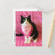 Peaches le Tuxedo Cat a l'air si joli sur cette carte postale. Elle porte son bandana rose "P" avec des pom-pom roses et vous regarde. Copyright pêche le chat de Tuxedo