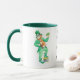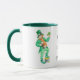 Une tasse blanche avec une poignée et une jante vert foncé. Un motif "leprechaun", dos et avant, est séparé par l'inscription : "Que la chance des Irlandais soit avec vous !"