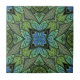 Ceramic tile design from "La Chanteuse V," an Apophysis fractal by Susan Wallace. Copyright © 2010, Susan Wallace. Symmetric organic design of bright green and aqua leaves with a central blue medallion.