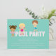 L'adorable invitation à la fête de la piscine porte les mots "pool party" avec des enfants en maillots de bain sur les lettres. La couleur Arrière - plan est le vert d'eau. Les champs de texte sont entièrement personnalisables.