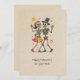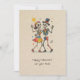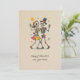 L'apocalypse, mes amis, n'est pas une affaire sombre. C'est une valse colorée et jubilante. Cette carte est un témoignage de cette vérité joyeuse, une scène de festivité impossible et d'acclamations provocatrices. Sur une toile de papier utilitaire et de bon goût, deux squelettes - l'un dans une cravate casquette et arc jaunâtre, l'autre dans une robe à pois-pois franchement trop colorée pour ce plan mortel - exécutent une danse. C’est une danse de bonheur profond et total, une célébration de la nature belle et absurde de l’existence et de sa conclusion inévitable. Le soleil, un simple cercle graphique, regarde, ses rayons rayonnent de lumière apathique. C'est un salut pour ceux qui refusent de prendre la fin des jours au sérieux. C’est pour les amis et les connaissances qui comprennent que même si nous sommes réduits à nos besoins essentiels les plus minimes, nous pouvons toujours trouver une raison de nous mettre à genoux. La note musicale flottant dans l'air est un clin d'oeil subtil à la symphonie tacite de la vie, une mélodie que nous entendons seulement. Les orbes de confettis épars sont la preuve que même dans le plus grand vide, quelqu'un, quelque part, fait une fête. Envoyez cette carte à la personne qui voit l'humour en tout, qui sait qu'un bon rire, comme une bonne danse, est tout ce qui compte en fin de compte.