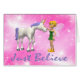 Une fée blonde douce habillée dans une peu de robe verte admire tendrement sa belle licorne blanche. Quand vous avez besoin d'un peu d'encouragement, croyez juste !