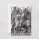 Albrecht Durer Knight Death et les invitations du diable. Gravure de bois de 1513. L’une des gravures les plus célèbres de l’artiste de la Renaissance du Nord Albrecht Durer, Knight Death and Devil, est une oeuvre allégorique représentant un chevalier d’Europe du Nord en pleine armure sur un cheval flanqué de Death, qui tient une heure de verre, et le diable en forme de chèvre. L'oeuvre représente la lutte chrétienne contre le temps et la tentation. Un grand cadeau pour les amateurs d'Albrecht Durer, d'art de la Renaissance du Nord, de gravures de bois et de représentations de chevaliers et médiévaux.