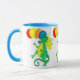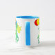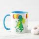 Une tasse colorée avec des dragons verts et jaunes, portant des ballons, d'une aquarelle de Judy Adamson.