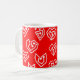 Cette tasse a un design moderne du milieu du siècle Valentin de mazes de coeur blanc éparpillés sur un champ de rouge.