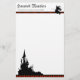 Halloween, papeterie personnelle avec une silhouette d'un manoir éffrayant hanté assis à une falaise au bas de la feuille et une sorcière volant sur un balai en haut de la page. Les deux images sont des contours noirs. Une bordure en pointillé noir et orange encadre le bas du papier et divise la zone d'en-tête de la zone principale de la page. Le texte dans la zone de titre est un modèle qui est facilement personnalisable, mais se lit actuellement : Haunted Mansion 2 Éffrayante Way, Cliffs Edge, Hallovania 90666