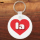 This keychain features a vibrant red heart containing the bold, white, rounded lower case letters la, a playful abbreviation for Louisiana, the pelican state, OR Los Angeles, the city of angels.