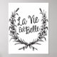 La vie est belle - French quote in a wreath, floral laurel. Black typography.