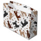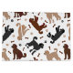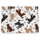 Cute labradoodles in brown, black and tan coats sit, stand and lay with scattered dog bones and paw prints on a white background.