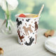 Cute labradoodles in brown, black and tan coats sit, stand and lay with scattered dog bones and paw prints on a white background.