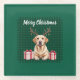 "This beautiful illustration features a detailed portrait of a loving Yellow Labrador Retriever with its characteristic broad head, gentle expression, and smooth golden coat. The dog is given a charming holiday touch with reindeer antlers adorned with small golden and green/blue ornaments. Two beautifully wrapped Christmas presents with red ribbons sit prominently on either side. This high-quality graphic is ideal for personalized holiday gifts for Lab owners, Christmas cards, apparel, ornaments, or any product celebrating this friendly and devoted dog breed."