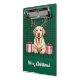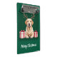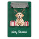 "This beautiful illustration features a detailed portrait of a loving Yellow Labrador Retriever with its characteristic broad head, gentle expression, and smooth golden coat. The dog is given a charming holiday touch with reindeer antlers adorned with small golden and green/blue ornaments. Two beautifully wrapped Christmas presents with red ribbons sit prominently on either side. This high-quality graphic is ideal for personalized holiday gifts for Lab owners, Christmas cards, apparel, ornaments, or any product celebrating this friendly and devoted dog breed."