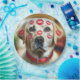 A close-up of a Labrador retriever dog with a red collar has multiple red lipstick kisses on its face giving it a cute look