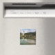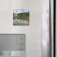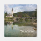 Aimant photo souvenir avec un paysage de lac Bohinj avec eau calme et reflet de l'église Saint Jean Baptiste et le pont de pierre à Ribcev Laz, Slovénie, au début de la saison d'automne avec le texte : "Slovénie, lac Bohinj".