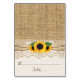 Elegant white lace, ribbon, sunflowers and burlap wedding seating place card featuring white lace on beige natural burlap or hessian with two crossed satin ribbons and sunflowers. Text in brown. Note that lace, burlap and sunflowers are all “printed on” and not real fabric or flowers. This elegant, sophisticated and romantic design with a rustic essence is part of a wedding set and is perfect for a country chic or western fall/autumn wedding with a neutral colour palette. Fold it in the centre to have a tent seating card.