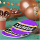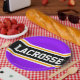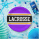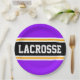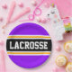 This sporty, athletic design features bold LACROSSE text inside a highlighted wide black stripe with double white and yellow racing stripes against bright purple background stripes. The text in this design can be personalized.