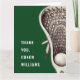 Unique lacrosse coach thank you card featuring lax stick illustration on team green background. Edit text to easily customize.