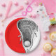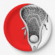 Cool lacrosse party plates featuring creative lax stick and ball art on red background for lacrosse party or team event.