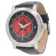 Lacrosse Shooter - Red and Black . Locked, cocked and ready to rock. Silhouette of lacrosse player holding stick, in the midst of firing a shot on goal. Circular emblem design in black, grey and red. Lacrosse player clock. Lacrosse timepiece.