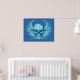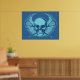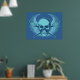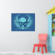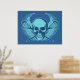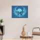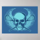 Lacrosse skull. Take off on the iconic skull and cross bones design. Skull and crossed lacrosse sticks with winged background element. Design style: Blue. Lacrosse poster print.