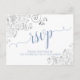 These beautiful RSVP postcards will make it easy for your guests to respond to your wedding invitation. They feature an elegant design with a white background and light blue lacy script calligraphy and pretty floral silver faux foil curls and swirls in the corners. The back is a form for your guests to fill out and return indicating the number attending and their choice of meals. There is space to enter a website so your guests can respond online if they prefer. Classy and sophisticated, these RSVP cards are a wonderful addition to your invitation suite.