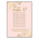 These beautiful table number cards feature a simple yet elegant design with gold script calligraphy on a light blush pink coloured background with a frilly gold faux foil floral filigree in the corners. Each card has room for the names of 10 guests so they also function as a seating chart making it easy for people to find their tables at your wedding reception.