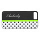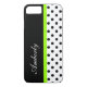 Custom monogram smartphone cases with chic black and white polka dots pattern and bright green fashion stripe you can customize, along with name drop space you can make your own by replacing the template name with your own monogram initials. Lets you carry your cellphone in style.