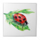 traditional watercolor painting of a lady bug in red with black dots sitting on a green leaf on a ceramic tile