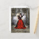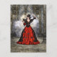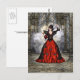3D digital render of a beautiful female wizard in a red and black dress with wings on a fantasy spooky castle background