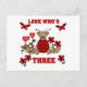 A teddy bear ladybug, red heart flowers, and text text that reads "Look Who's Three" on a cute 3rd birthday design.