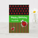 A modern birthday card design which you can personalize with your own text and the name of the recipient. The color scheme is red, green, black and white, and there are co-ordinating ladybugs and stripes patterns on the front. Type in the boxes to change the greeting on the front "Happy Birthday", the name, and the greeting inside "Ladybugs to bring you good fortune in the year ahead".