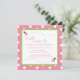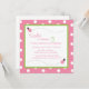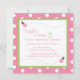 Adorable pink and white polka dot background with green stitched frame and cute little ladybug square birthday invitation.