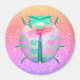 Cute ladybug in mint green, covered in hearts in colors of pink, purple and green. She has a chiffon bow around her neck, and is set on an ombre glitter look background of purple, pink, and peach.