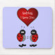 Cute mouse pad featuring a pair of in love ladybugs holding hands, a large red heart floats over them with the phrase, "Ladybug, I Love You" on it. Cute Valentine's Day gift.