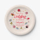 Cute ladybug theme birthday party plate featuring illustration of cute red and pink bugs with wildflowers. The text says "our little ladybug is turning X."