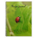 Le devant de ce carnet en spirale de la revue présente ma photo d'une coccinelle sur des feuilles verts. L'Écriture biblique de Psaume 34:3 est au bas de l'image et les mots "Journal de prière" sont aussi sur l'image. Écrire des demandes de prières, des listes ou des pensées est un bon moyen de les suivre et de suivre les prières auxquelles on a répondu. Prier pour les autres est un privilège et il y a de la joie quand les prières sont accomplies. Cela ferait un grand cadeau à quiconque aime garder les prières et les pensées dans le souvenir et est pratique pour se rencontrer en communion ou en études bibliques. Il ferait aussi un joli cadeau de Noël ou de Pâques.