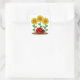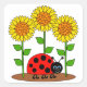 This whimsical red ladybug stands in front of a group of yellow and orange sunflowers.