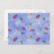 A cute springtime pattern. Red ladybugs with black spots, green and yellow leaves floating around, cute pink daisies, and lavender butterflies make up this delicate and dainty pattern on a blue purple background.
