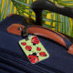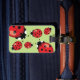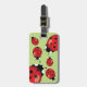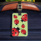 This luggage tag features Destei's cartoon ladybugs on a green background colour. On the back side there is a personalizable text area for contact information.
